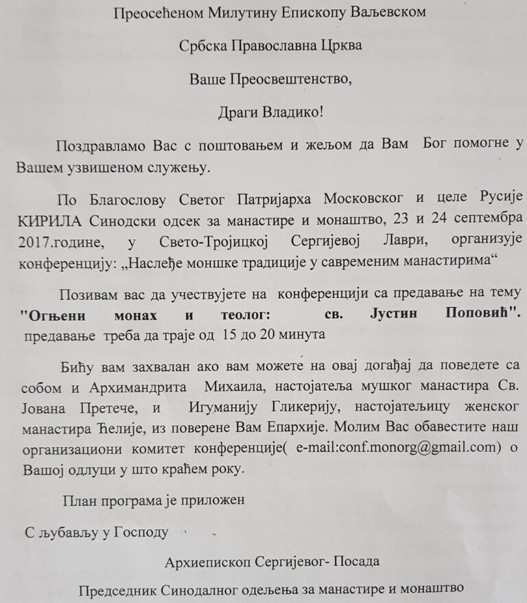 Позив Епископу ваљевском г. Милутину за учешће на конференцији у Свето-Тројицкој Сергијевој Лаври 07.11.2017.