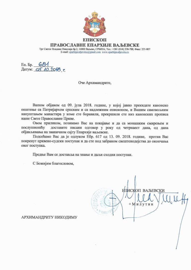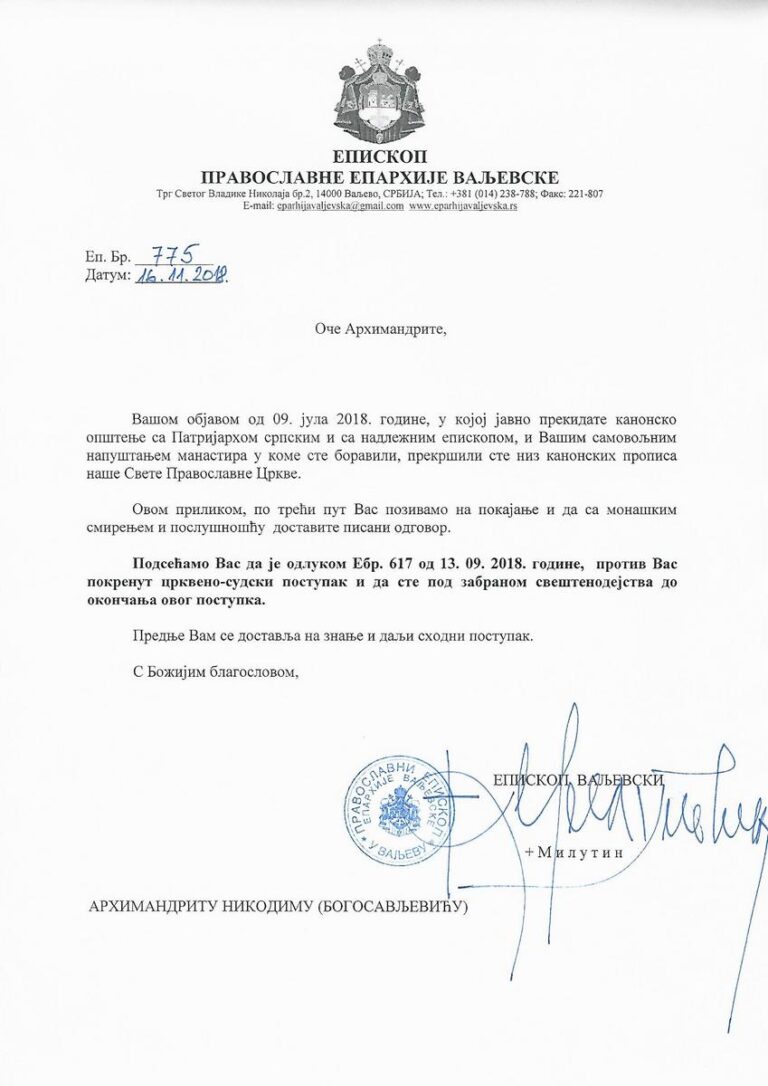 Трећи позив на покајање архимандриту Никодиму (Богосављевићу)