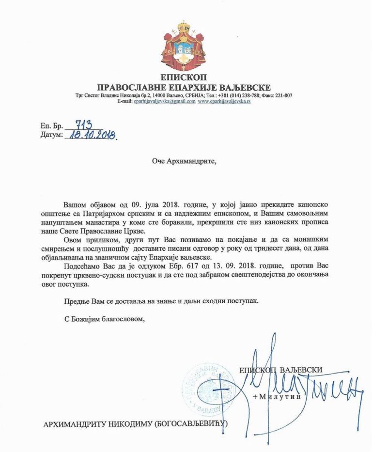 Други позив на покајање архимандриту Никодиму (Богосављевићу)