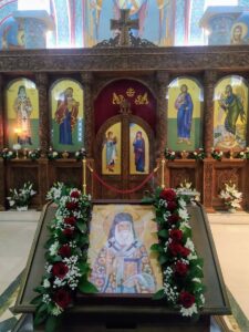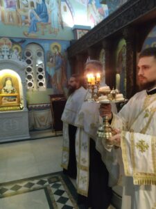 Мноштво верника приступило је Светој тајни причешћа, а потом и поклоњењу моштима Светог Нектарија. Преломљен је славски колач, а на крају Литургије одслужен помен новопрестављеном пастиру Цркве Христове Патријарху српском Г. Иринеју, који је управо данас сахрањен у крипти Храма Светог Саве у Београду.