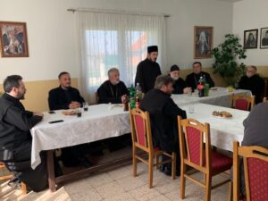 Након исповести уследио је братски састанак у парохијском дому Храма Светог Николаја Мирликијског, где се игуман Георгије, настојатељ манастира Лелић, обратио браћи свештенослужитељима преносећи благослов Светог Владике Николаја, са жељом да се уз Божију помоћ дође и до прославе великог јубилеја у част преноса његових моштију из Америке у родно село Лелић. Осврнувши се на новонасталу ситуацију и искушења која су снашла нашу Цркву и свакога понаособ, као и на годишњицу од упокојења нашег духовног оца Епископа Милутина, отац Георгије је јеванђељским речима поучио браћу свештенослужитеље да имају љубави , праштања и трпљења Христовога, Који је, узевши тело човека, показао велику љубав према нама, не осуђујући никога.