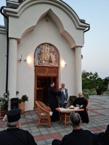 У свом пригодном слову, Владика Лаврентије захвалио је харизматичном песнику и присутном народу, узносећи молитвену захвалност Господу на дару за „многаја и благаја љета“ свога земнога века. Истакао је да је 12. августа напунио 63 године живота у монашкој ризи, а 16. августа пуних 54 године архијерејске службе, подсећајући присутне да је то, у осмовековној историји Српске Православне Цркве, најдужи архијерејски стаж једног епископа. Цитирајући познате стихове Јована Јовановића – Змаја: „И где год је трунка пепела му пала, ту је нова љубав роду засијала“, исповедио је своју веру да је његова задужбина никла из светосавске „трунке пепела“, указујући на храм као живо сведочанство истинитости бесмртних стихова. Владика је захвалио на Божјој милости и помоћи у току подизања своје задужбине, првога храма посвећеног првом српском архиепископу и просветитељу у Шабачкој епархији, свецу на чији је дан 27. јануара 1935. године рођен и први пут угледао светлост Божјег дана.