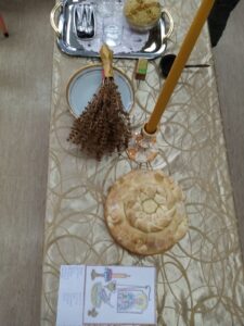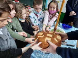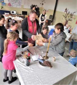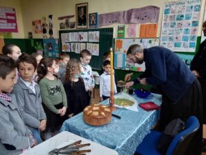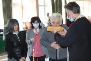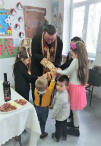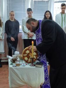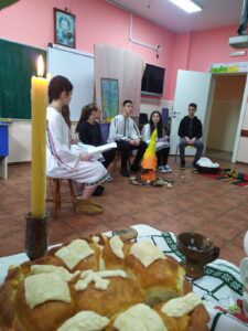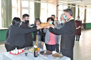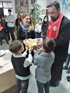 Обред ломљења славског колача предводио је свештеник Предраг Велимировић уз помоћ вероучитеља. Домаћин славе ове године била је помоћница директора Верица Адамовић- Тешић.