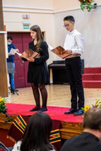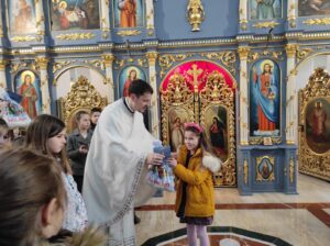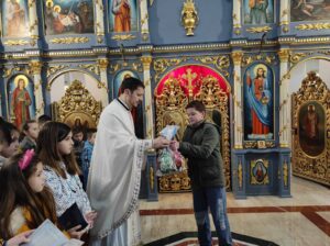 После рецитације награђени су пакетићима које су им уручили њихови вероучитељи.