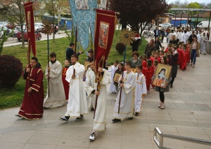 „Сви смо позвани да будемо као деца, јер она су чистог срца и срцем приватају реч Божју и остварују је“, поручио је у празничном обраћању ђакон Мија Бојиновић на Врбицу у Храму Светог великомученика Георгија. Вечерњим богослужењем је началствовао протојереј – ставрофор Јован Петровић, уз саслуживање ђакона Бојиновића. Након вечерњег су освећене и подељене врбове гранчице, које су учесници сабрања носили у литији око храма. Обележавање Врбице улепшала су деца из оближњег вртића „Колибри“, извођењем пригодног програма.