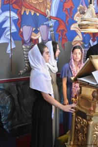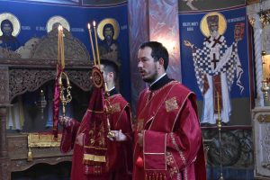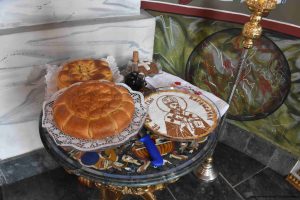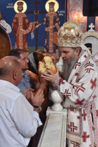 По заамвоној молитви Његово Пресвештенство Епископ ваљевски Г. Исихије благословио је славске дарове хлеб и жито, који су принесени у славу Божију и у част Светог Саве горњокарловачког.