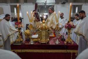 Приликом Литургије, Владика Исихије у чин свештеника рукоположио је досадашњег ђакона при Покровском храму Милорада Петровић, помоливши се Мајци Божјој да га својим молитвама заштити и укрепи његов свештенички пут. На крају Литургије прочитана је молитва за очување брака и породице.