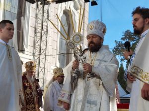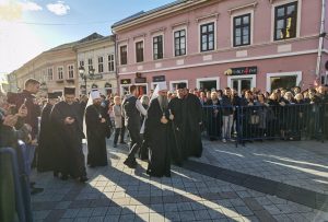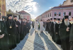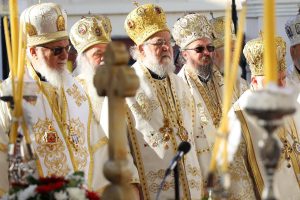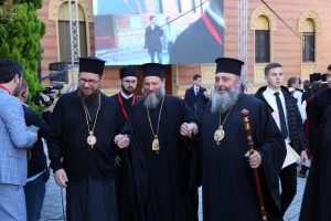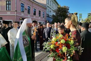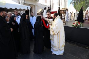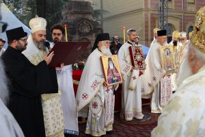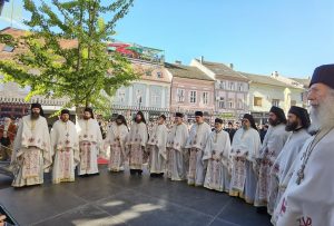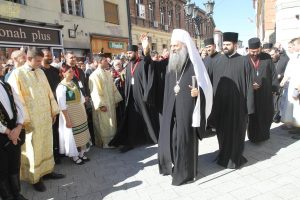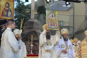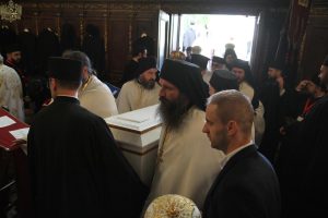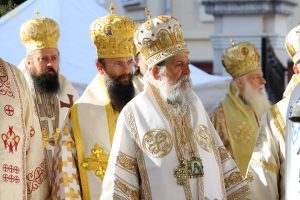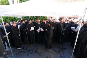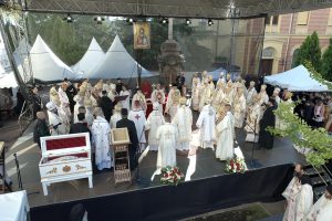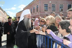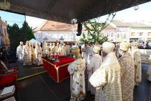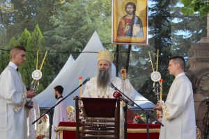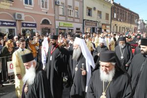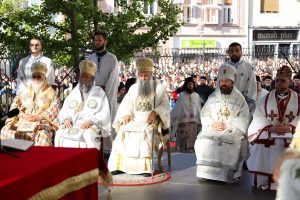 Пред почетак свете Литургије, иконе и кивот са моштима новопросијавших светитеља наше Цркве изнете су пред верни народ у литијском ходу свештенства и архијерејâ предвођених Патријархом српским.