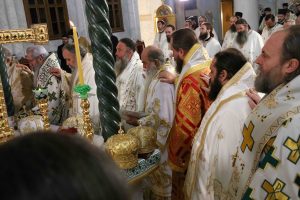 Тада је изабрани и наречени Епископ узео свето Јеванђеље и потписано Исповедање вере и принео их Патријарху, који је исто ставио у Јеванђеље. Патријарх Порфирије је након тог чина предао Јеванђеље изабраном и нареченом Епископу, те су га затим увели у олтар на јужне двери. Одмах затим је почела света архијерејска Литургија, да би, по освештаној богослужбеној пракси, након Трисвете песме, два протопрезвитера извела из ђаконика изабранога за хиротонију и довели га на солеју пред Царске двери, одакле је вођен двојицом архијереја уведен у олтар где је трипут обишао Часну Трпезу. У сваком опходу наречени и изабрани Епископ је целивао Часну Трпезу, док га је сваког пута Патријарх благосиљао Часним крстом. Након тога, архијереји су привели изабраног Епископа пред Часну Трпезу, где му је Патријарх на главу положио крај омофора, а архијереји отворено Јеванђеље. Потом су сви положили руке на њега, док је патријарх Порфирије читао молитве хиротоније. По завршетку молитви Патријарх је новохиротонисаног епископа Алексеја обукао у сакос и омофор, а затим положио на њега крст, панагију (енколпион) и архијерејску митру свечано узглашавајући: „Аксиос!“ и „Достојан!“, што су сво свештенство и народ у радости отпевали.