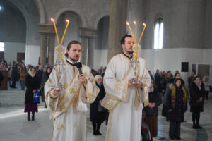 Његово Преосвештенство Епископ ваљевски Г. Исихије је предводио литургијско сабрање у Храму Васкрсења Христовог, уз саслуживање свог заменика протонамесника Филипа Јаковљевића и више свештенослужитеља из Ваљева, као и појање певнице и хорова „Хаџи Рувим“ и „Емануил“ под управом Милице Степановић- Бабамилкић и Вање Урошевић. Слово у част празника произнео је протонамесник Филип Јаковљевић. Указавши на смирење са којим Господ Христос прилази Светом Јовану и тражи да Га крсти, те тиме „испуни сваку правду“, а потом јављање Бога Оца са небеса, протонамесник Филип Јаковљевић је навео да се у овом догађају Света Тројица јасно открива. У њено име се крштавамо, венчавамо и свакодневно је славимо у молитвама и богослужењима, истакао је проповедник.