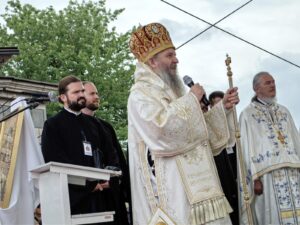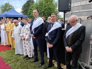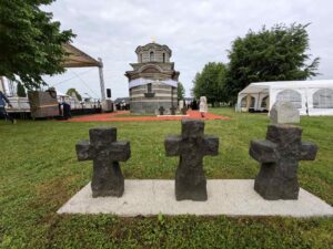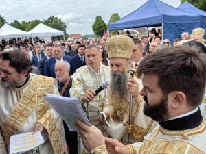 Нека Господ упокоји све пострадале у овом логору, логорима који се налазе у непосредној околини, као и у целој Европи и целом свету. Нека исцели сваку рану и преобрази сваку муку, љубављу својом, наиласком Светога Духа Утешитеља, обрише сваку сузу која је овде пала и од ње, овога места, ове свете мученичке земље направи блато које ће свима нама помазати очи да прогледамо и видимо да истинског братољубља и заједничког живота нема без истинског богољубља према једноме у Тројици Богу. И зато браћо и сестре, знајте да је важније од свега да где год да се налазимо, не треба само да чувамо своју православну веру и кроз њу чувамо оно што припада фолклору нашег народа и обичајима, него треба да живимо својом православном вером, да живимо Јеванђељем Христовим. Да знамо да на питање, које су многи мени упућивали, нарочито кад се нађу изван матице: Како оче да научимо своју децу да буду и остану Срби, постоји један једини одговор: Наравно да ћете учити децу њиховом пореклу. Али ако их не будете учили, пре свега и изнад свега, православној вери, иако их и научите ком роду припадају, засигурно пре или касније, када се у њима разбукти духовна глад а ви им нисте дали православну веру, они ће потражити храну на другим трпезама. И када нађу духовну храну на другим трпезама, када не буду православни хришћани, без обзира што сте их научили да буду Срби, пре или касније заборавиће и то своје српско порекло. Шта више, ако не дај Боже, узму са неке трпезе која је квази духовна и нуди потпуно отровну храну, не само да ће заборавити којем народу припадају, него ће сигурно и неретко, заборавити и на име свога оца и своје мајке. Али ако их будете учили православној вери, ако их будете утемељили на аутентичном, изворном, духовном идентитету, а то је Христос и Јеванђеље Његово, онда и све оно што је њихово и ваше, што припада нашем народу, добиће свој истински и прави идентитет и печат и своју трајну вредност. И зато браћо и сестре да се окупљамо у овом храму, да служимо пре свега Свету литургију, да се причешћујемо Телом и Крвљу Христовим, и у сваком храму, да се молимо за невино пострадале на овоме месту, да се њима молимо, да се окупљамо у храмовима Божјим, да се тамо сусрећемо једни са другима и сви заједно са живим Богом, Господом и Спаситељем нашим коме нека је слава сада и увек и у векове векова! Амин!