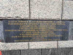 Темељи овог храма су не само испод нас него свуда око нас. Свака мученичка кост овде остављена и положена је уграђена у њега, повезана са њим. Овај храм је плод који је изникао из семена које су биле те посејане свештене кости. Овај храм је као неки свештени ледени брег – видимо само мали његов део који је изнад воде, а много већи је испод ње, испод нас. И не само испод нас него и изнад нас, на небесима, у хоровима светих где поју наша пострадала браћа, војници и сељаци, официри и учитељи, једва порасла деца и честити старци. И не само изнад нас, него и у нама је овај Храм, браћо и сестре ако га понесемо са собом, ако га уградимо у своја срца, ако понесемо у себи исте оне вредности, иста уверења и опредељења, које су имали, којима су живели и за које су своје животе дали наша приснопамјатна браћа која овде почивају.