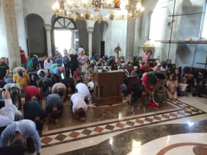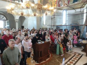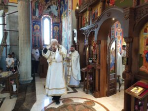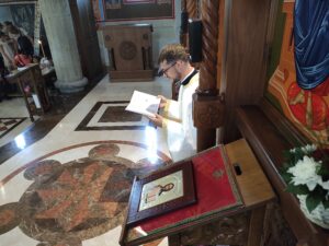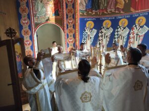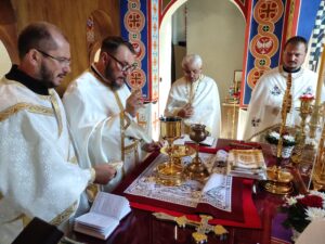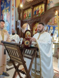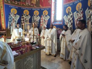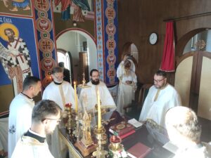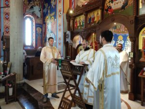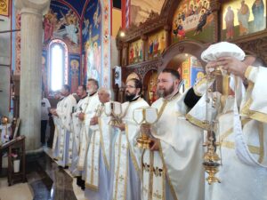 У недељу, на дан празника, служена је Света Литургија, којом је началствовао архијерејски намесник посавски Александар Вучај, уз саслуживање протојереја и старешине новог храма Гордона Василића, протојереја ставрофора и старешине храма Силаска Светог Духа на Апостоле Дарка Павловића, настојатеља манастира Грабовац јеромонаха Андреја, протонамесника Немање Павловића, јереја Петка Влаховића, јереја Александра Петровића и ђаконa Владана Нешковића.